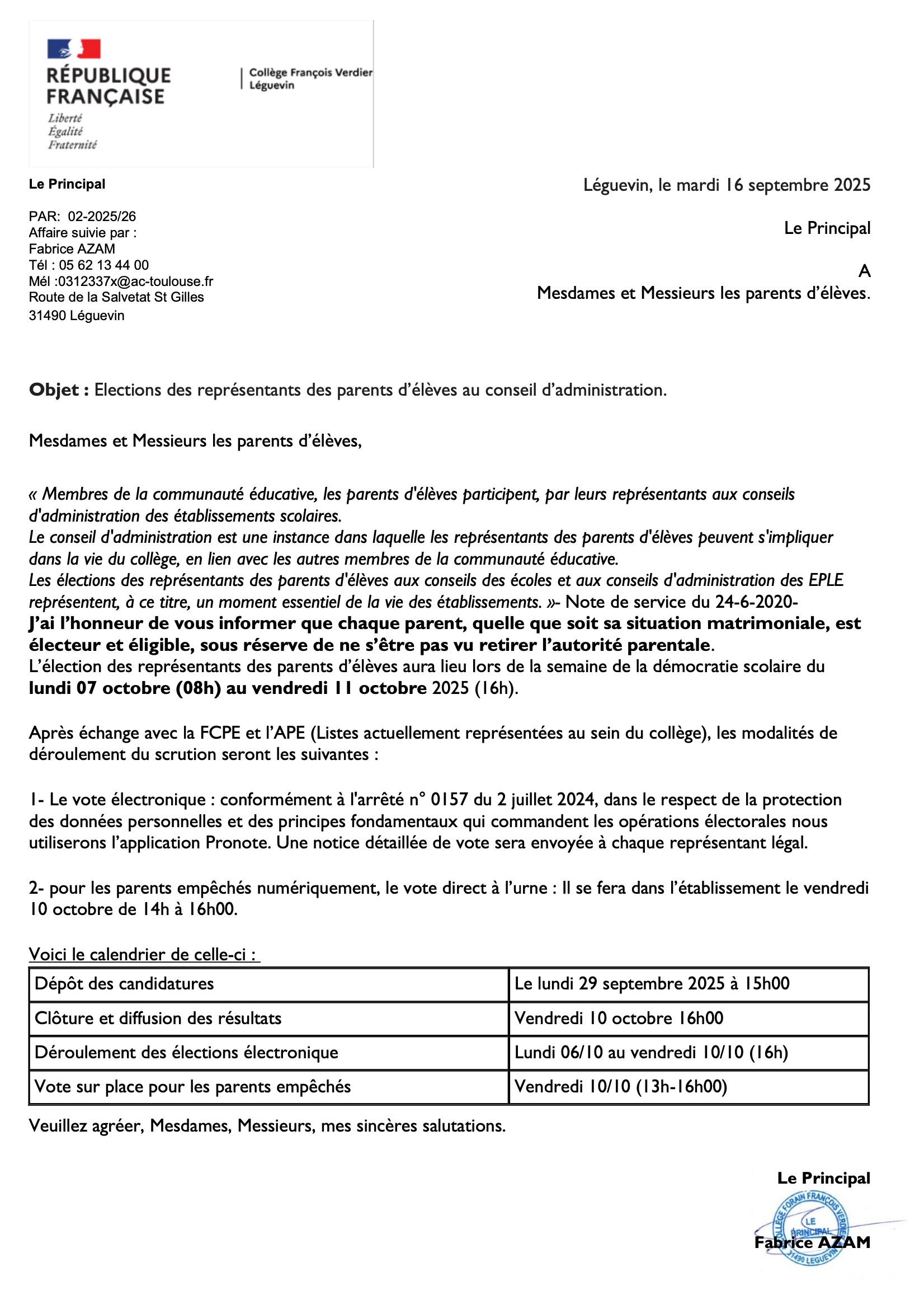 Elections des représentants des parents d’élèves du lundi 06 au vendredi 10 octobre 2025 à 16h sous format électronique