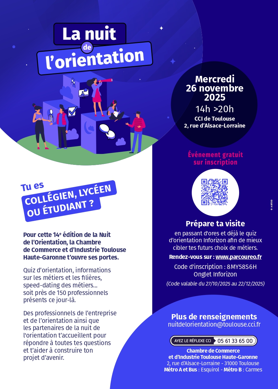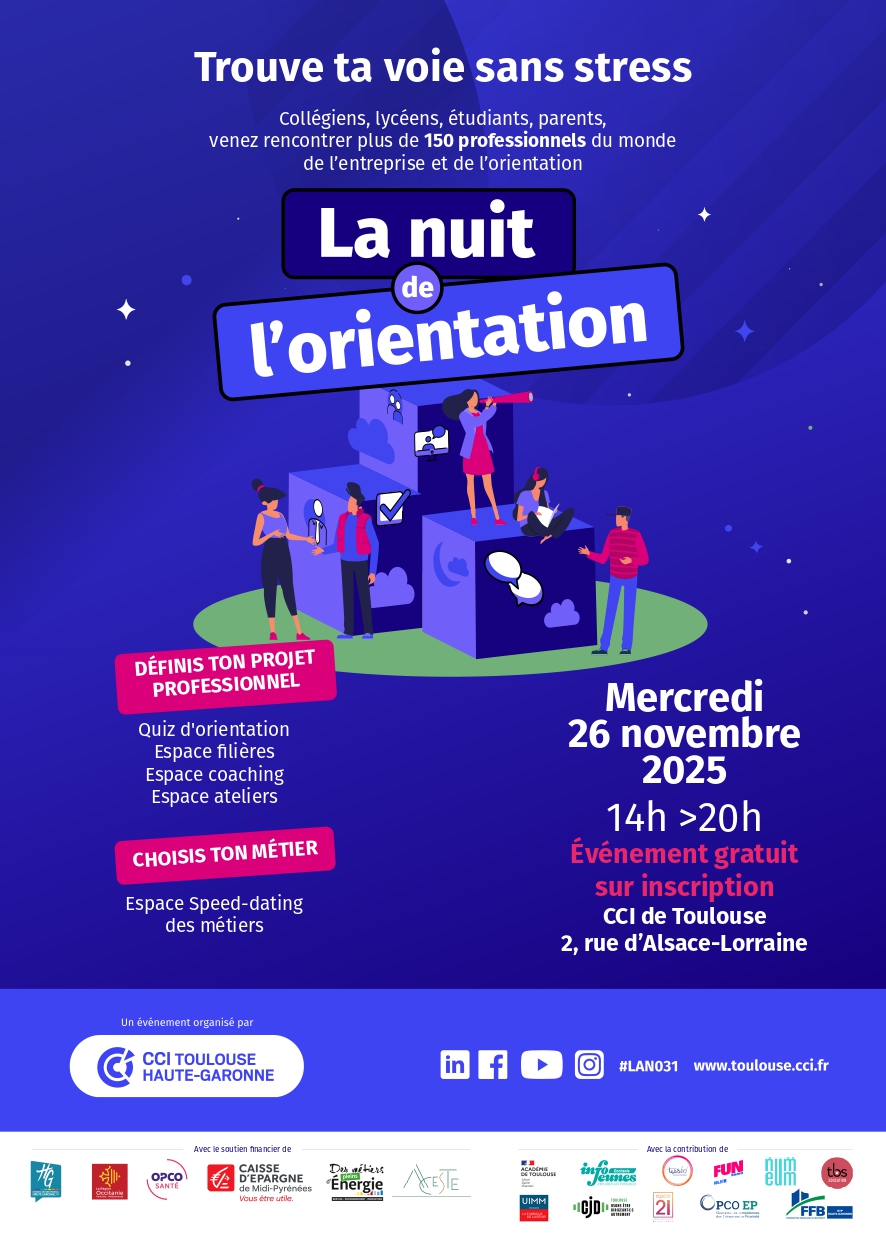 La Nuit de l’Orientation est un évènement organisé par la Chambre de Commerce et d’Industrie Toulouse Haute-Garonne qui permet aux jeunes d’échanger avec des professionnels du monde de l’entreprise et des partenaires de l’orientation pour découvrir les métiers, les filières et les carrières qui s’offrent à eux et les accompagner dans leur futur choix d’orientation professionnelle.