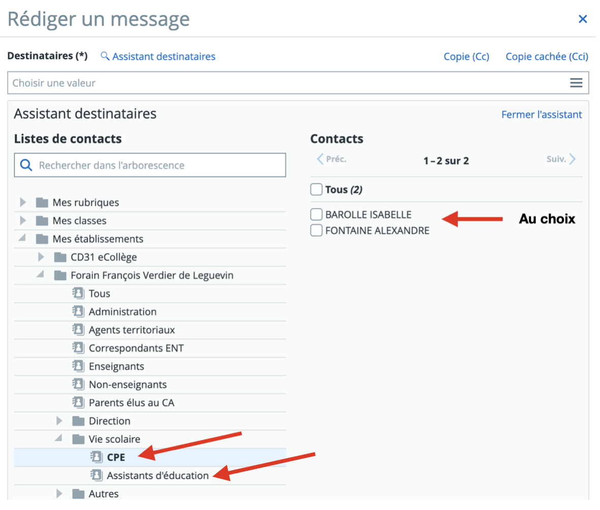 > Utiliser la messagerie de l'ENT en ciblant le CPE référent ou les AED:
